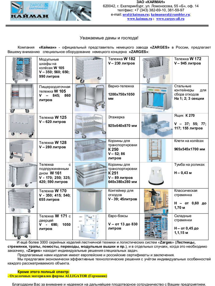 Алюминиевые тележки ZARGES (Германия) являются незаменимыми помощниками для транспортировки и хранения. Будь то внутризаводская транспортировка, поставка из филиалов, транспортировка вещей, снабжение или утилизация. КАЙМАН, ЗАО - официальный представитель компании «Zarges» (Германия) - крупнейшего в Европе … Читать дальше концерна по производству подъемной техники и логистических систем из легких сплавов.